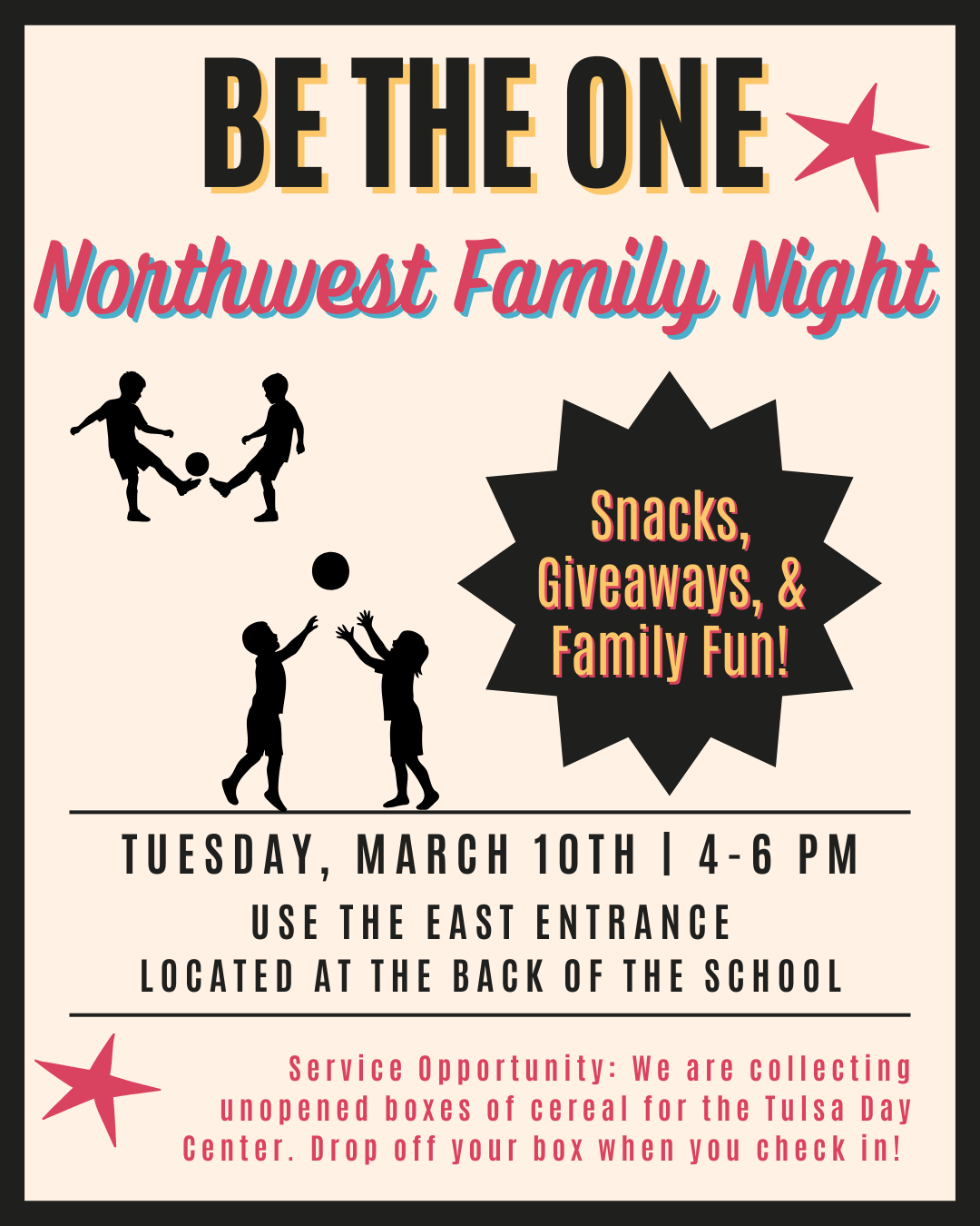We hope you’ll join us for our Be the ONE Northwest Family Night on March 10th! This come-and-go event will be a fun evening for our Northwest families, and students will get special items to take home!