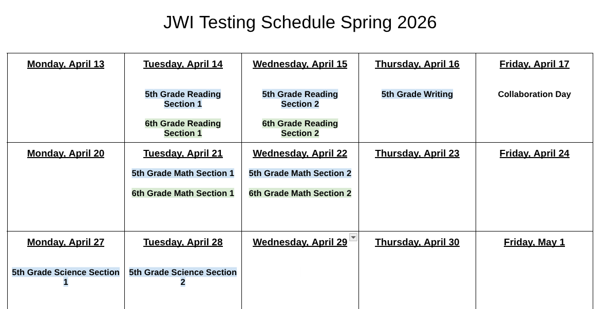 Jenks West Intermediate's dates for state testing are below. To meet the state requirement, we must test all of our students. Please make sure your child arrives at school on time and please remember to schedule all appointments after school hours on testing days. If you know ahead of time that your child will be absent on one of the testing days, please fill out this form so that we can get a testing session scheduled for him/her prior to the absence.