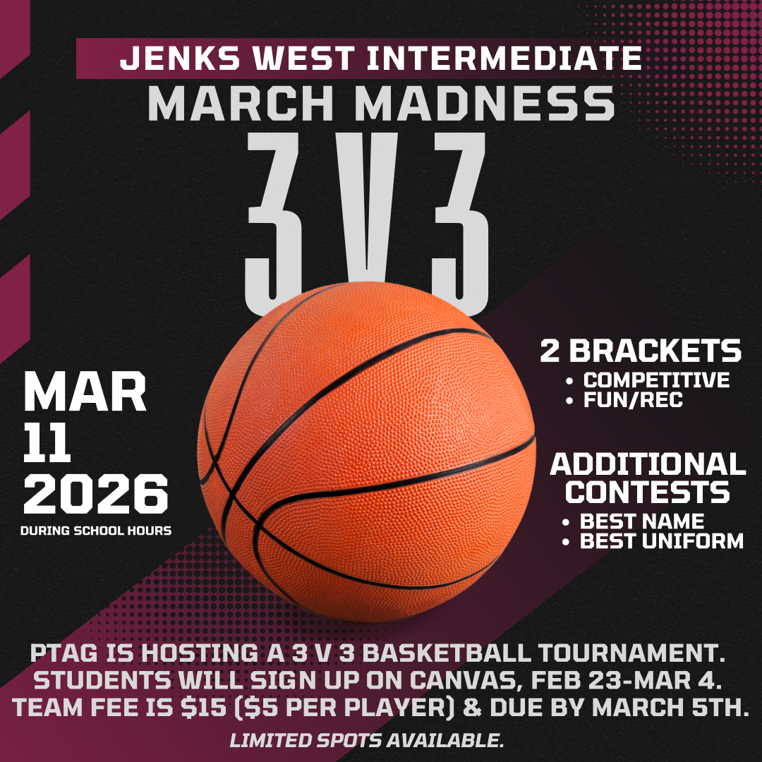 We are excited that the JWI PTAG will be hosting a March Madness 3 vs. 3 Basketball Tournament on March 11, held in the gym and on the outdoor basketball courts. There will be both a recreational bracket and a competitive bracket; however, students may only participate in one bracket. Students will form their own teams, create team names, and are welcome to dress to match their team theme. Game times will be announced after the March 4 sign-up deadline.
